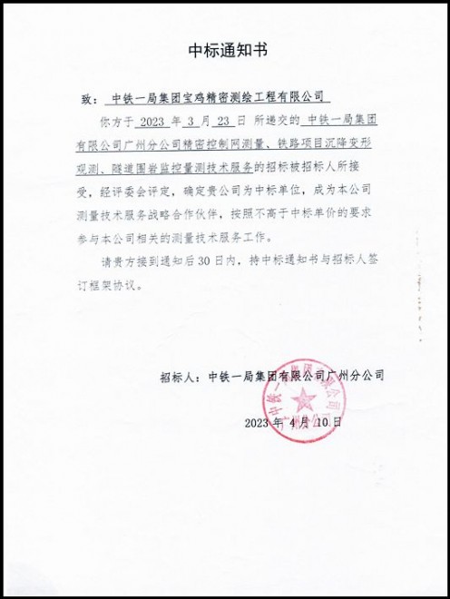 宝鸡讯:近日,精密测绘分公司收到广州分公司精密控制网测量、铁路项目沉降变形观测、隧道围岩监控量测等技术服务中标通知书,成为广州分公司测量技术服务战略合作伙伴,为全面进入广州分公司测量领域奠定了坚实基础。